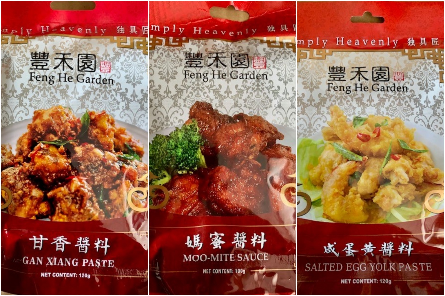 The products are: Gan Xiang Paste, Salted Egg Yolk Paste and Moo-mite Sauce.