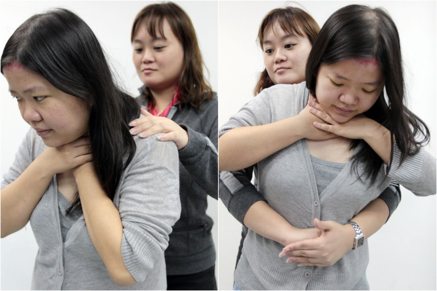 If the person is in a full choke, he will show the universal distress sign of choking by clutching his neck area with his thumb and fingers (left). If the person is not able to cough and you are not trained in the Heimlich manoeuvre (right), do not thump his back, as it may cause the foreign object to be lodged deeper.