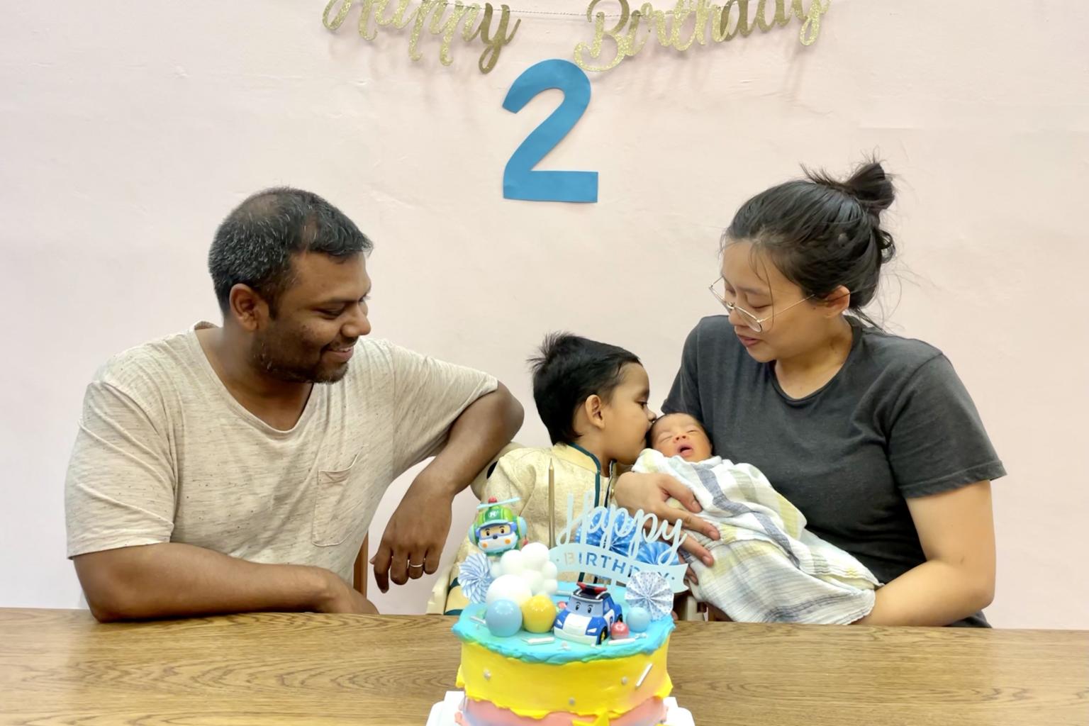Ms Suzanna Tang, 28, with her husband, two-year-old son and newborn.