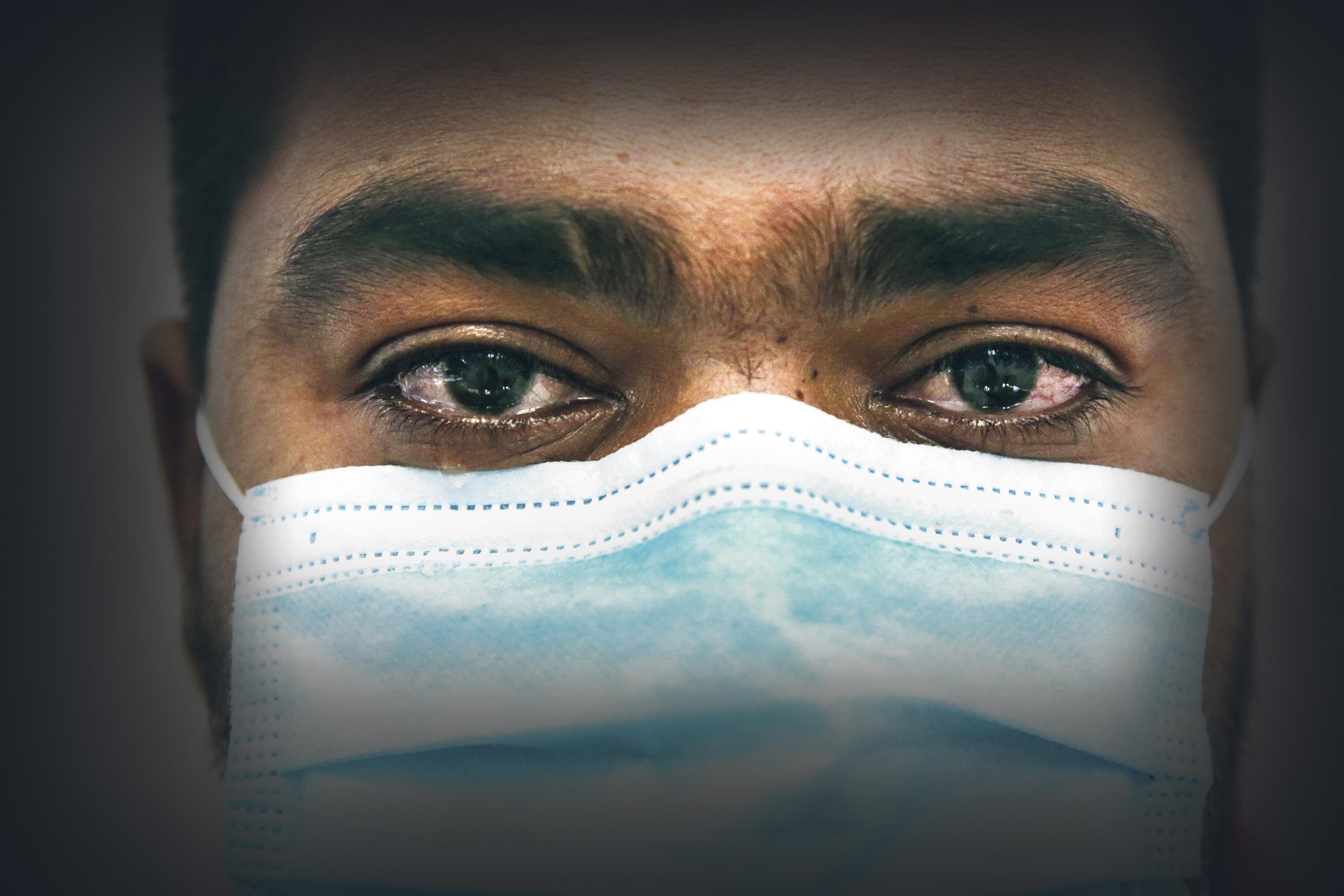 A migrant worker tears after a nasal swab test at Ng Teng Fong General Hospital, on April 28, 2020.