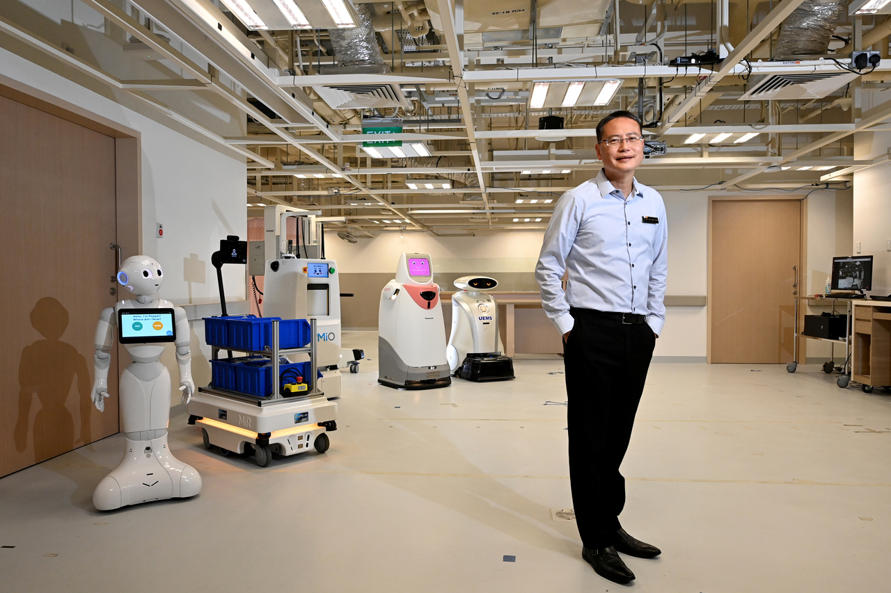 Changi General Hospital CEO Ng Wai Hoe with robots that are used in the hospital.