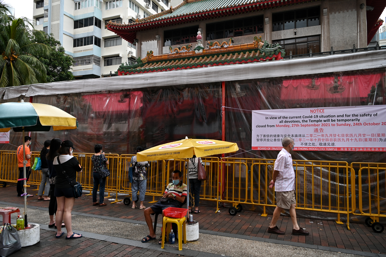 People praying outside the Kwan Im Thong Hood Cho Temple Waterloo Street on Sept 27, 2021. The latest Covid-19 restrictions aim to slow the pace at which cases are rising.
