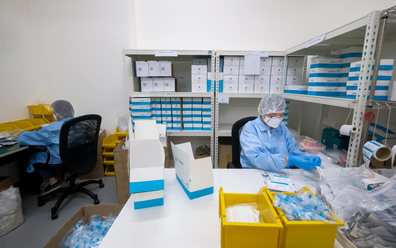 Staff of local company Camtech Diagnostics working at its antigen rapid test kit production factory in Henderson Road.