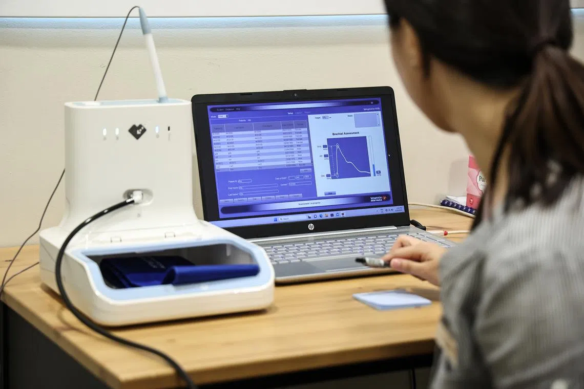 A health coach from Alexandra Hospital’s Healthy Longevity Clinic, conducts pulse wave velocity assessment on a patient.