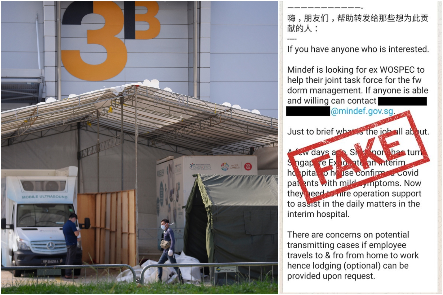 Messages hiring workers for foreign worker dorms, Expo isolation facility are fake: Mindef, MOH
