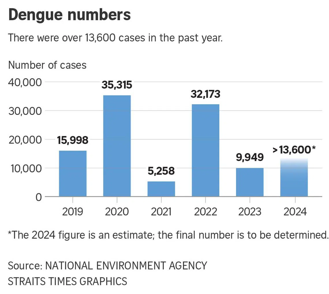 SINGAPORE - There were more than 13,600 cases of dengue locally in 2024, an increase of over 36 per cent from the year before.