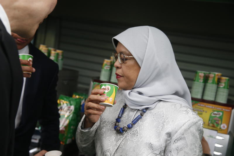 President Halimah Yacob made and drank the first official cup of Milo Gao Kosong at Plaza Singapura on June 19, 2018.
