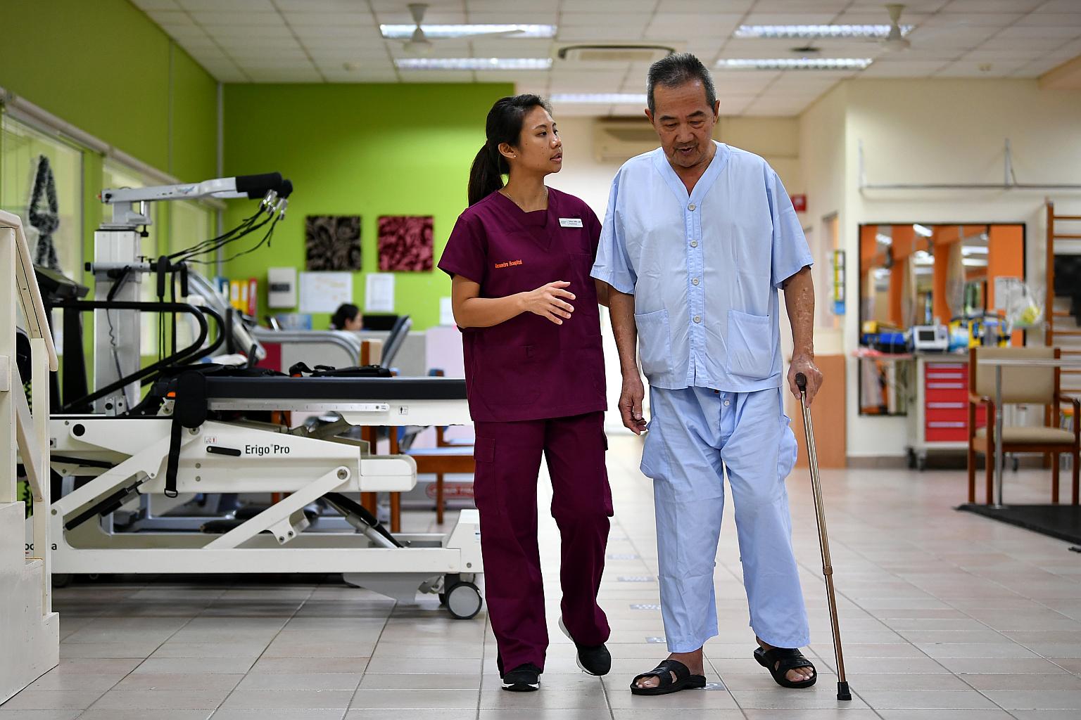 Physiotherapist Chua Xing Jun, 26, walking with Mr Cheng Yam Kwang, 66, in a simulated home environment at Rehabilitation Centre of Alexandra Hospital, on Dec 14, 2018.