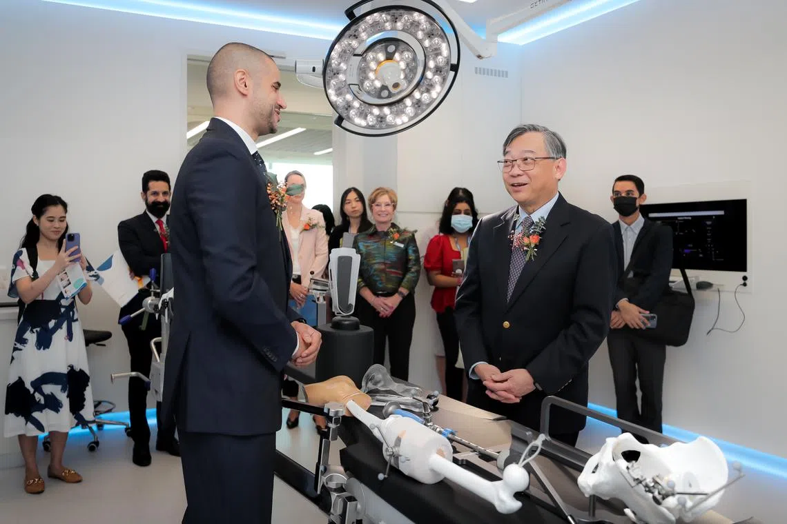 Trade and Industry Minister Gan Kim Yong (right) touring the Digital Operating Room of the Future in the new Smith+Nephew Academy at Alice@Mediapolis, on Nov 9, 2022.