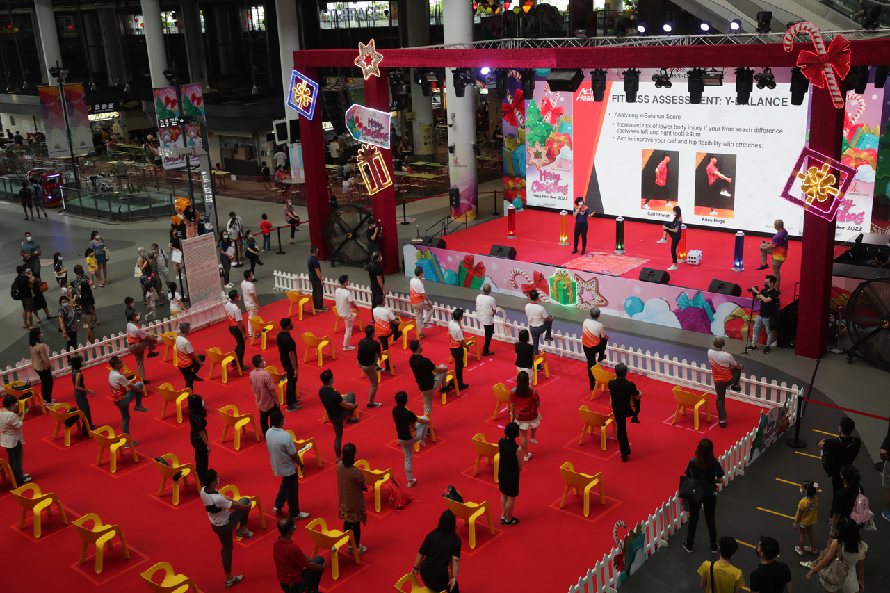 Residents join in during the Get Active workout performance by ActiveSG during the launch of a Health Up! Programme at Our Tampines Hub, Festive Plaza on Nov 27, 2021.
