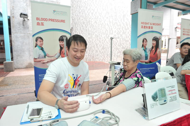 File photo of Dr Lam Pin Min checking the blood pressure of an elderly person during a health event in his constituency.