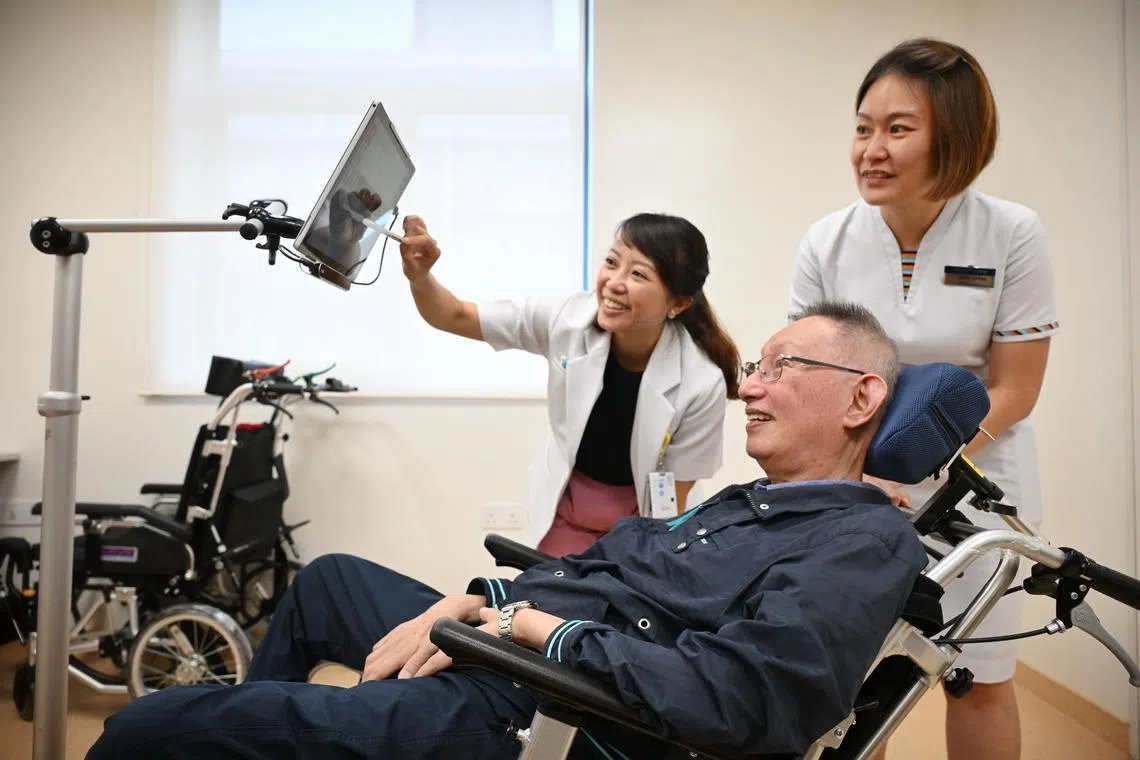 Palliative care patient Chia Shyh Shen (bottom) practising on a communication device with Tan Tock Seng Hospital staff on May 29.