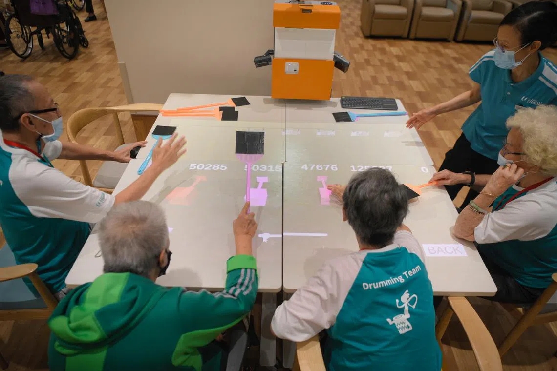 Seniors use virtual reality to participate in an interactive game at the NTUC Health Nursing Home at Jurong Spring.