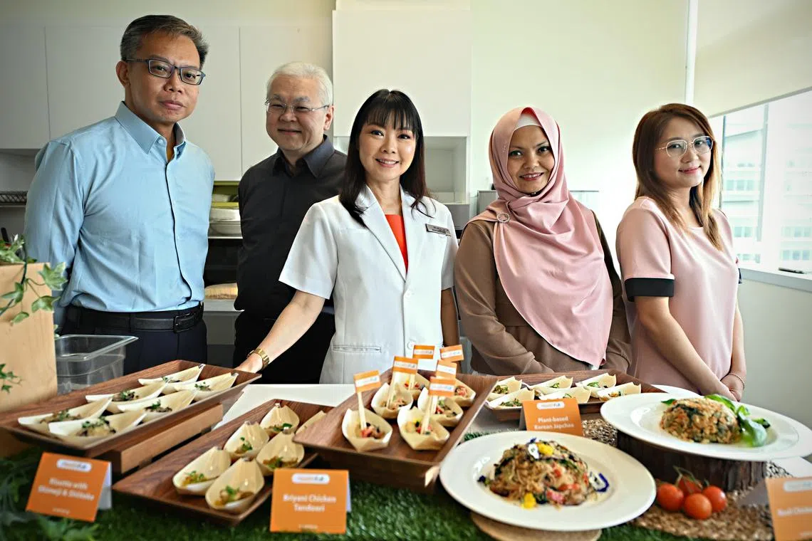 Dr Lim Su Lin (centre), chief dietitian at NUH’s Department of Dietetics, with dishes prepared according to the healthy keto diet. With her are trial participants (from left) Shawn Tan, 45, Tan Ban Thong, 61, Aisha Aziz, 48, and Lilis Suryani, 38.