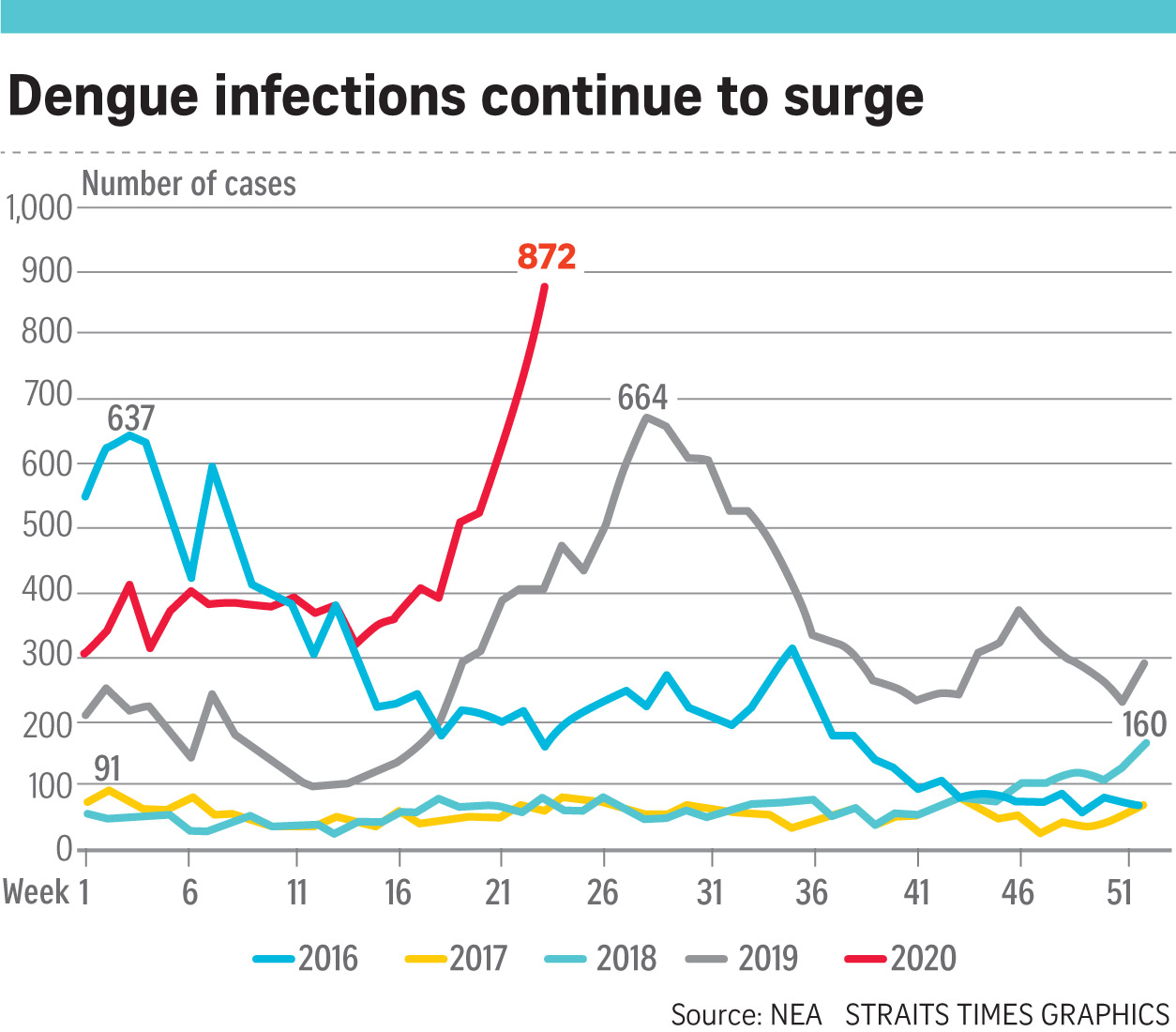 Dengue infections this year have surged past the 10,000 mark this week. The 872 cases last week are more than double the 391 cases just five weeks ago.