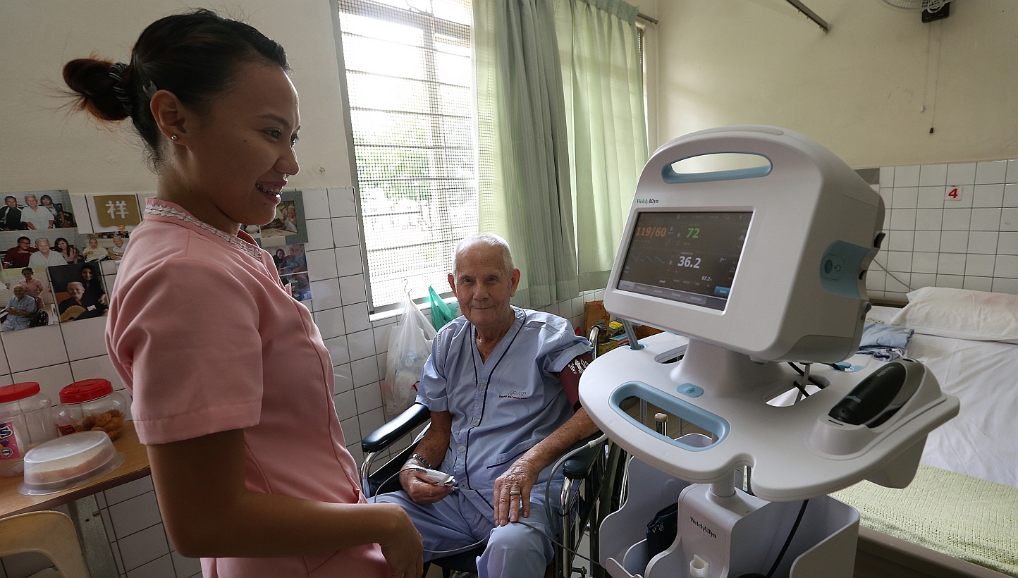 Previously, at Kwong Wai Shiu Hospital nursing home, nurse manager Seah Bao Juan had to record on paper residents' blood pressure or pulse rate readings.