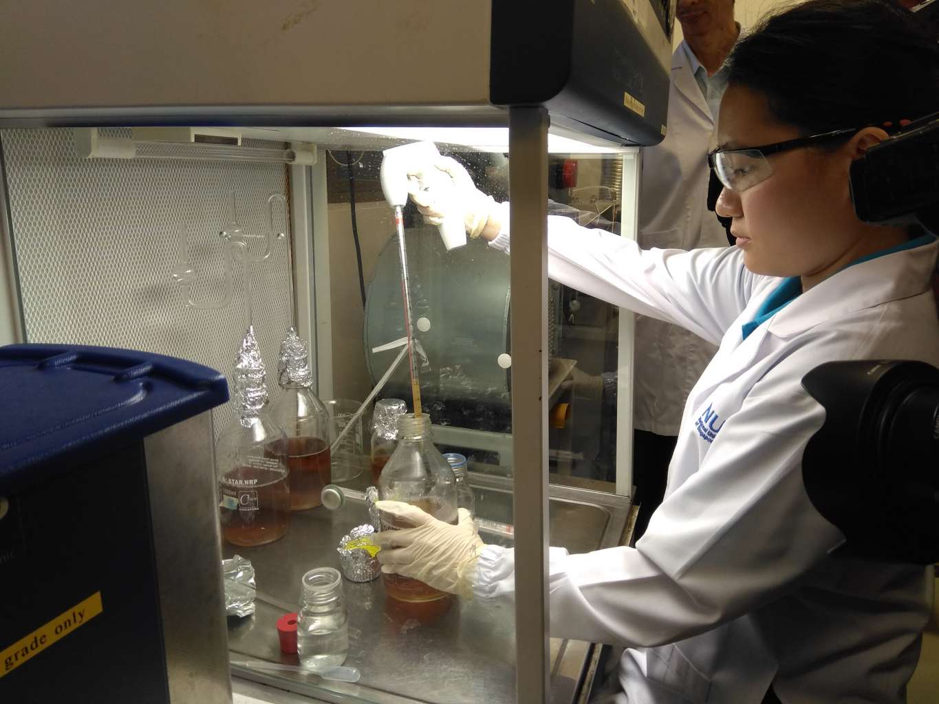 Ms Alcine Chan adding the L26 probiotic strain to the wort during a demonstration of the brewing process at a food processing laboratory in NUS.