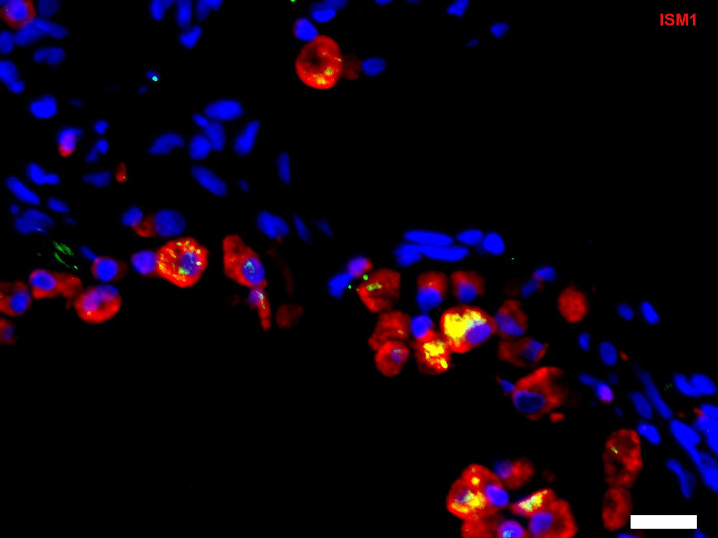tgcopd - This image shows the ISM1 protein (in green) produced by alveolar macrophages (AMs) (red), which show up in this image via double immunofluorescence staining. Yellow represents the presence of both the ISM1 protein and AM in the same location, with blue representing the nucleus of a cell. Within the human body, ISM1 is found in the largest quantities in the lungs