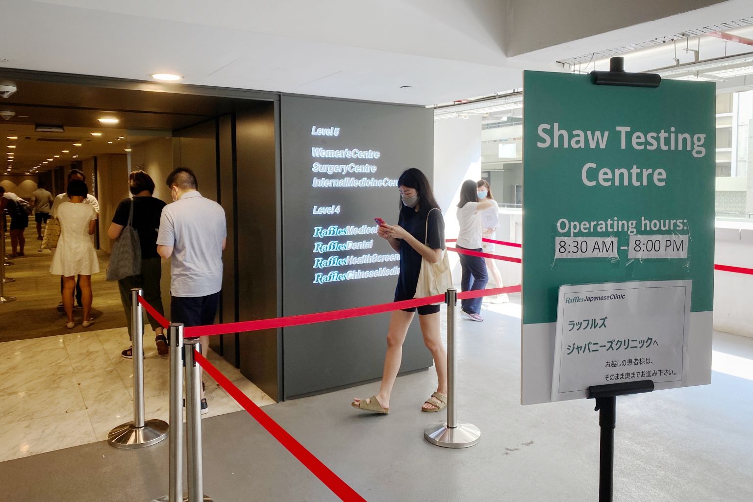 People who visited Ion Orchard queueing to enter a testing centre at Raffles Medical at Shaw Centre on June 12, 2021.
