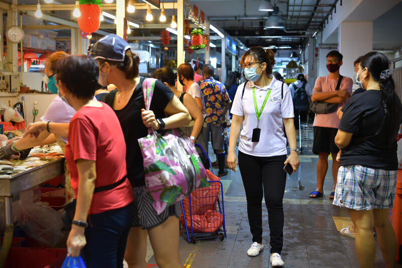 A National Environment Agency officer patrolling Holland Drive Market and Food Centre on April 18, 2020.