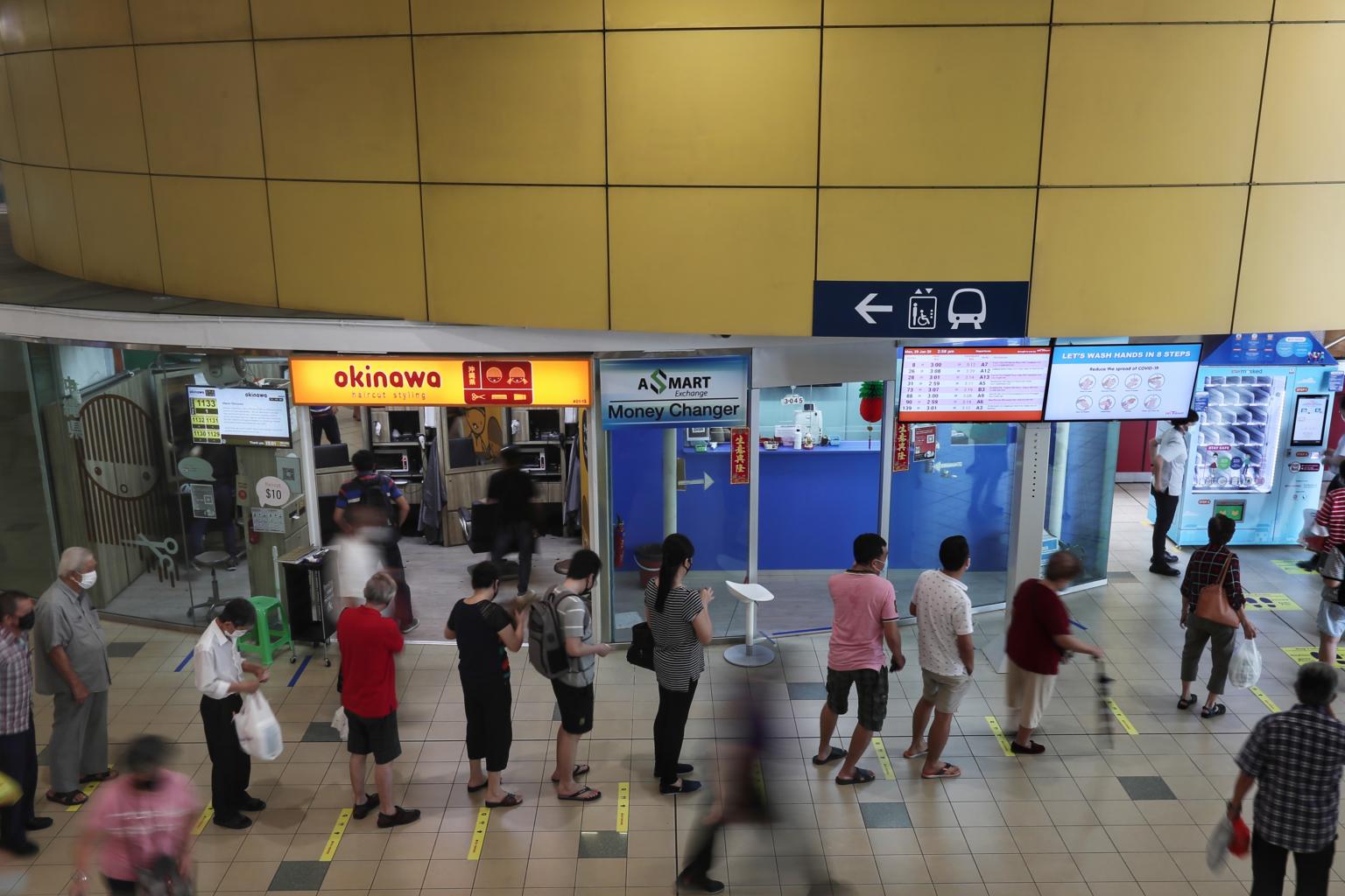 People queue to collect reusable masks at mask vending machines at the Toa Payoh bus interchange.