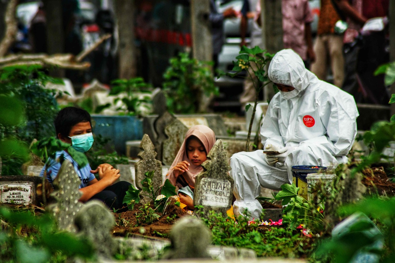 Family members praying by the grave of a Covid-19 victim at a cemetery in Lhokseumawe, Aceh, on May 18, 2021.