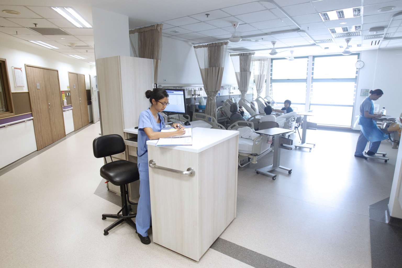 A nurse working at a dedicated working space in a new ward, with brighter lighting and a more spacious feel, at Tan Tock Seng Hospital (TTSH) on May 22, 2014.