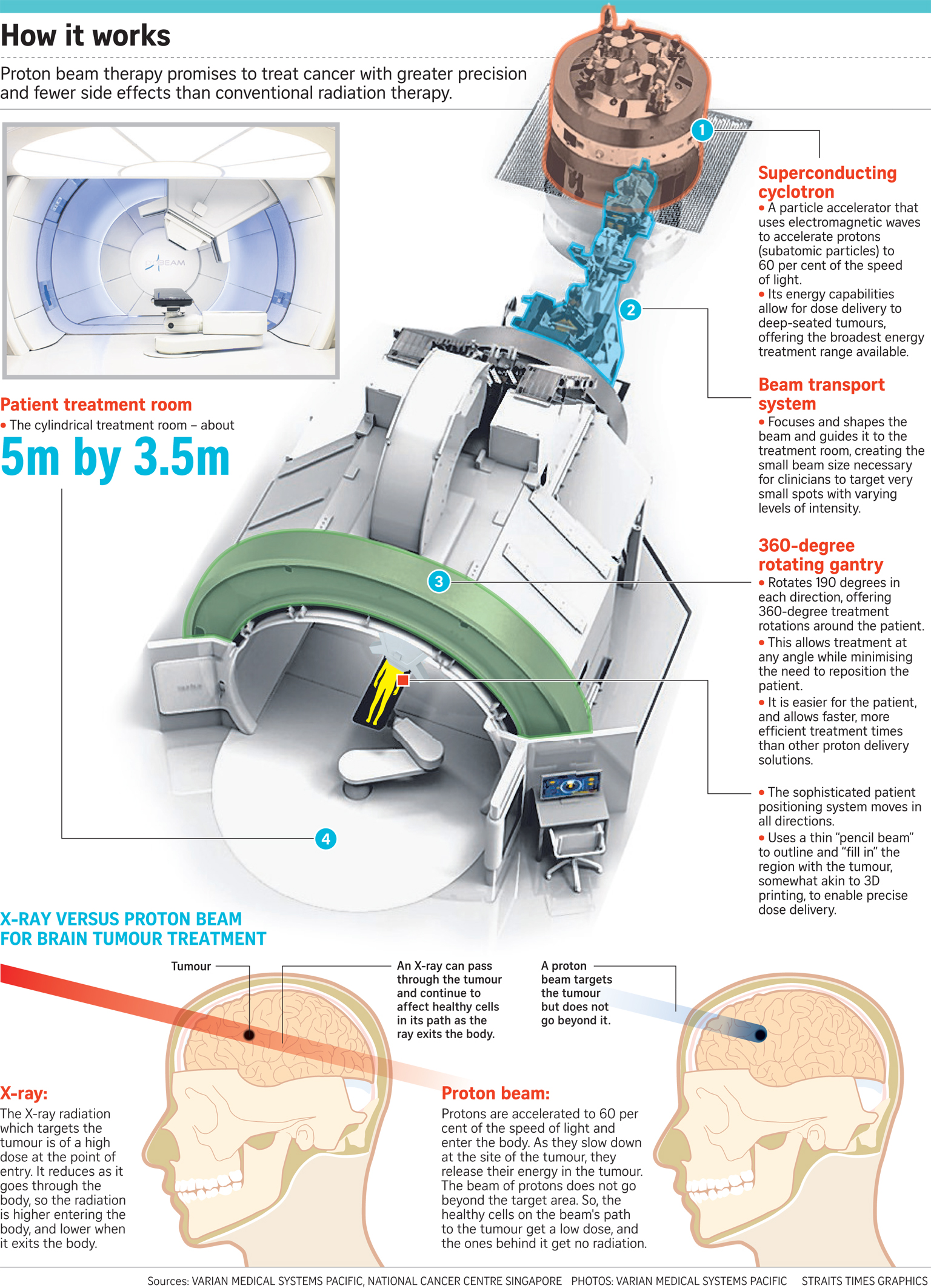 SAM chief medical officer Kwek Boon Han said proton therapy uses about 60 per cent less radiation than conventional radiation therapy, which uses X-rays or gamma rays. This results in a lower risk of damage to healthy tissue around the tumour.