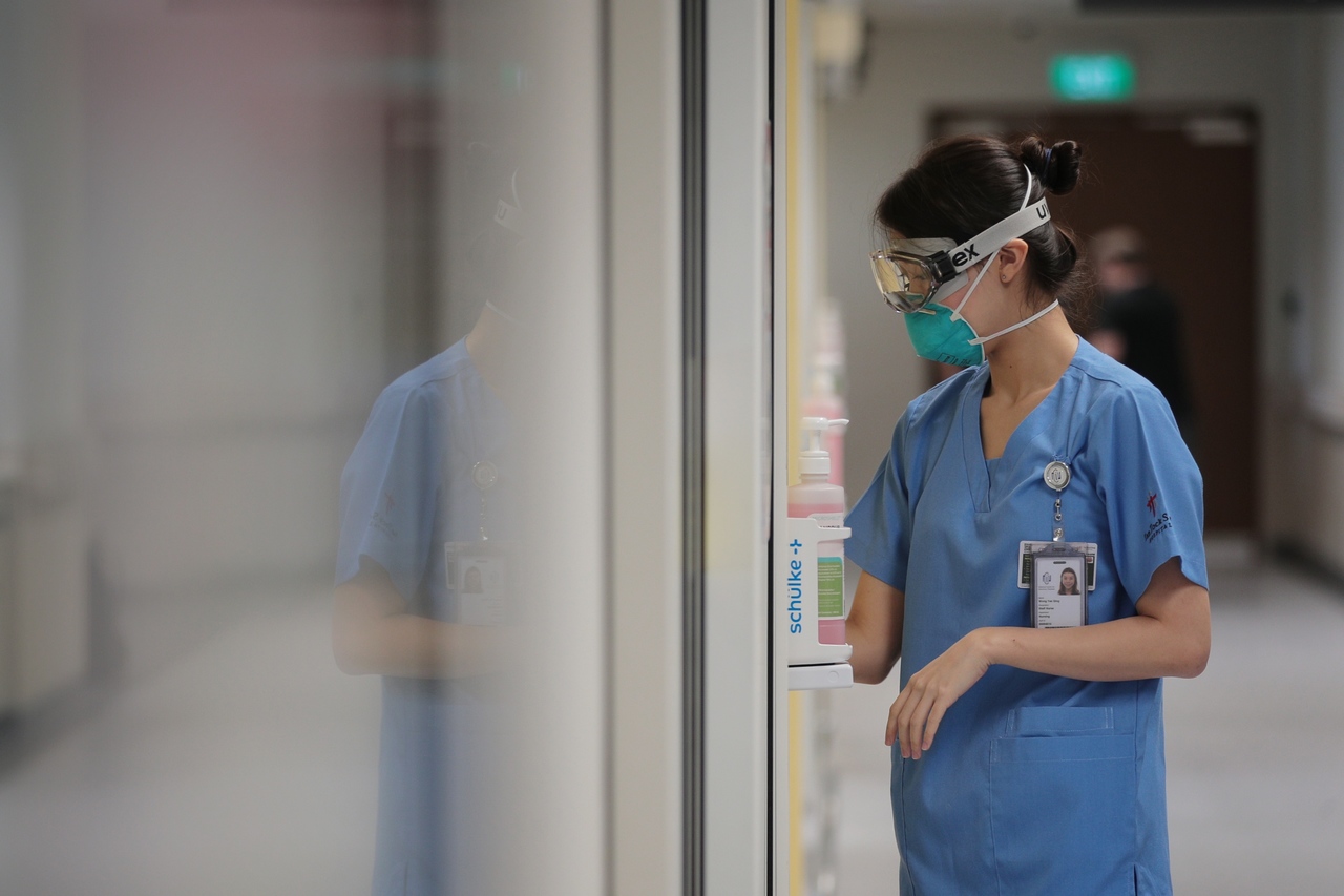 A NCID nurse clad in N95 mask and goggles on Feb 14, 2020.