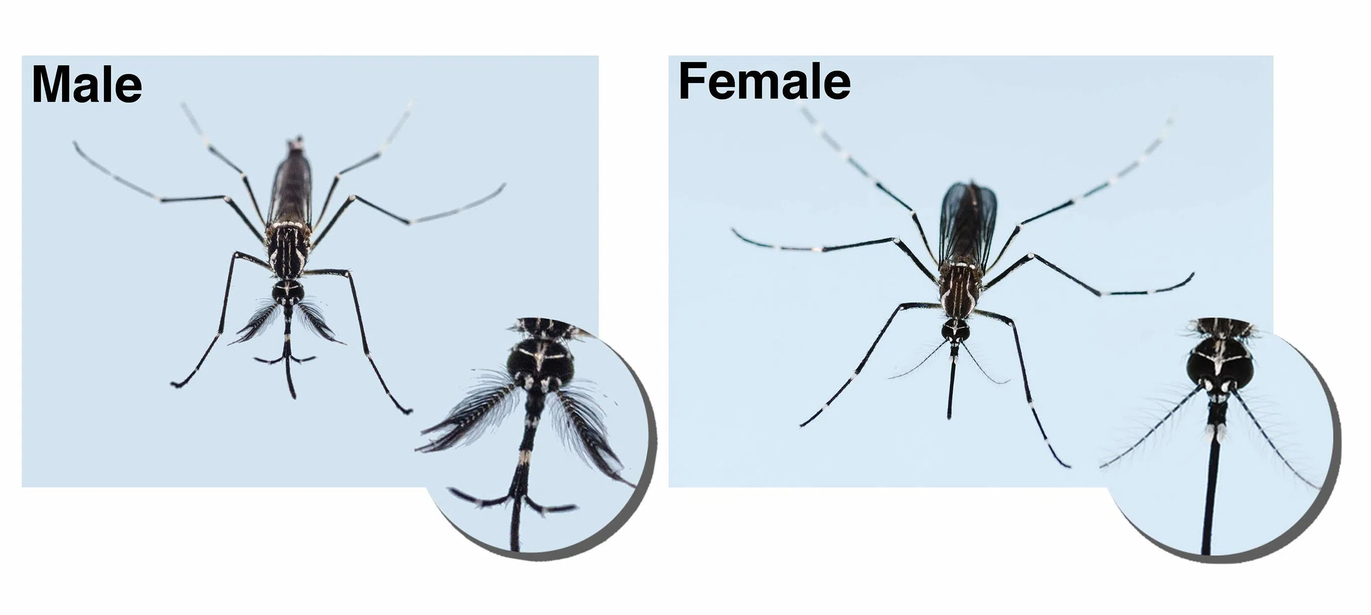While both male and female Aedes aegypti mosquitoes have black and white stripes on their bodies and legs and two white bands on their backs, males are smaller in size and possess feathery antennae.