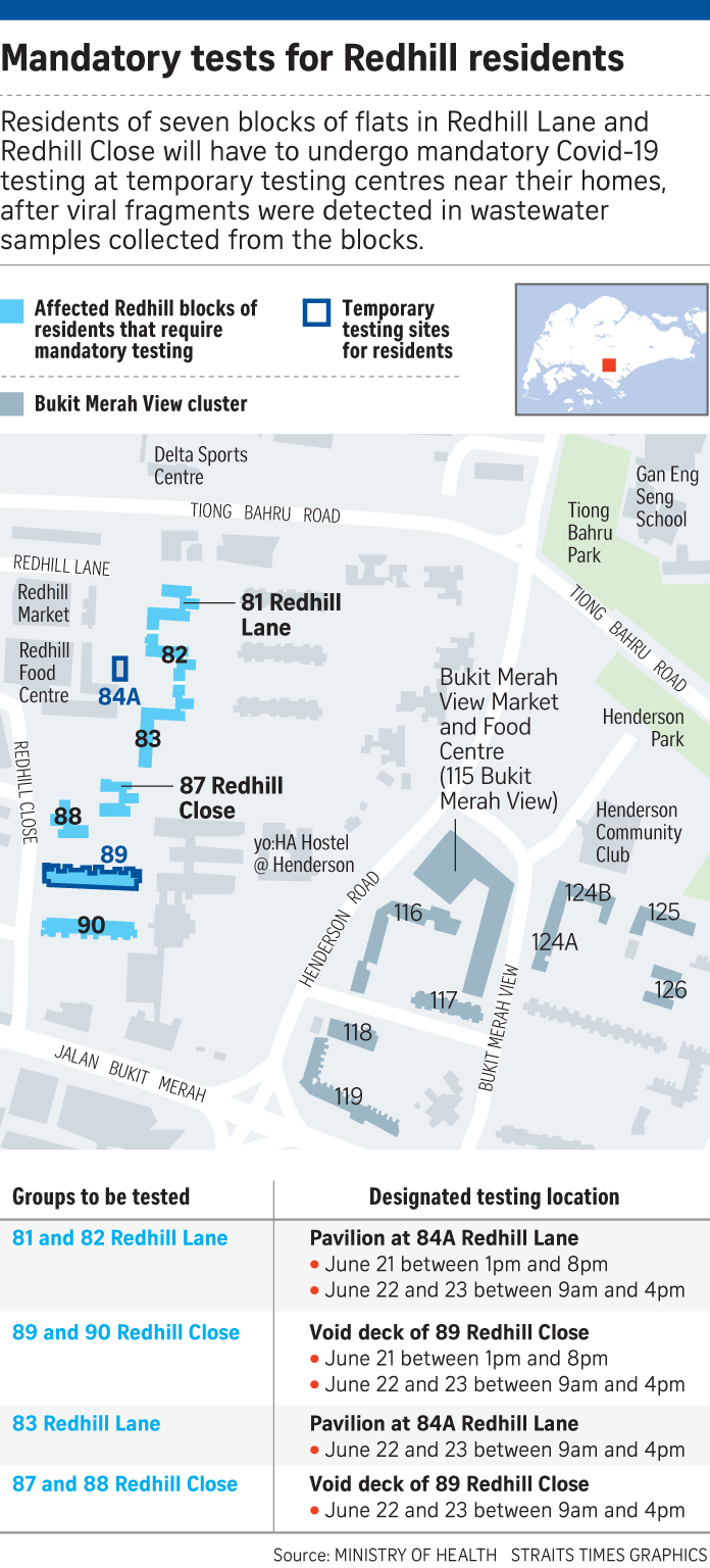 Residents living in seven Housing Board blocks in Redhill Lane and Redhill Close will have to undergo mandatory Covid-19 testing after viral fragments were detected in wastewater samples collected from some blocks.