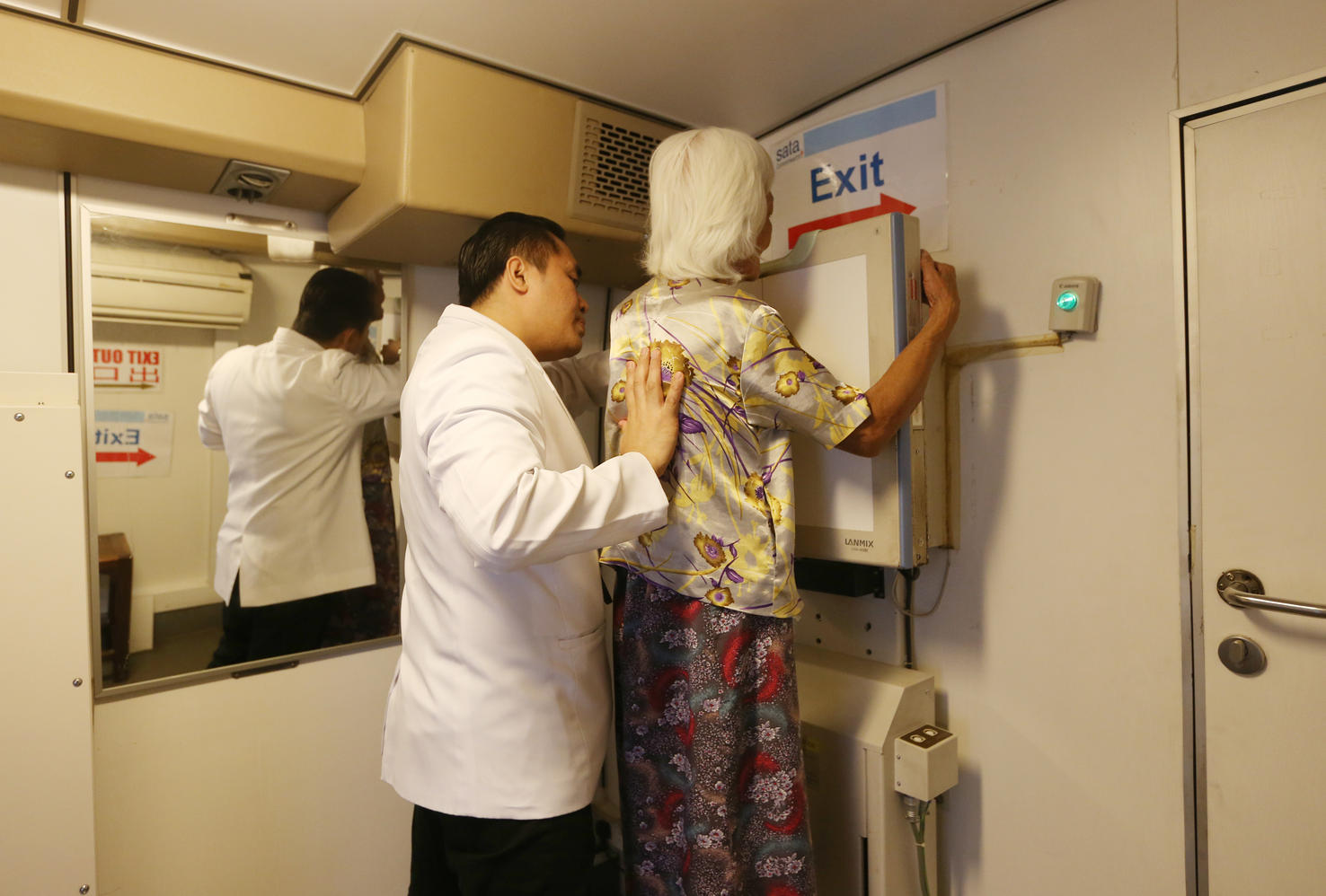 A SATA staff helps a resident of Block 203 Ang Mo Kio Ave 3 take an X-ray in a medical services bus at the carpak on June 16.