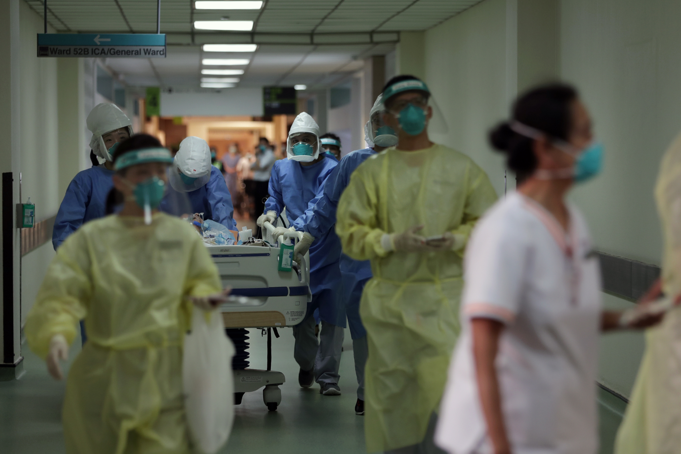 Medical staff transfer a suspected Covid-19 patient at Singapore General Hospital.