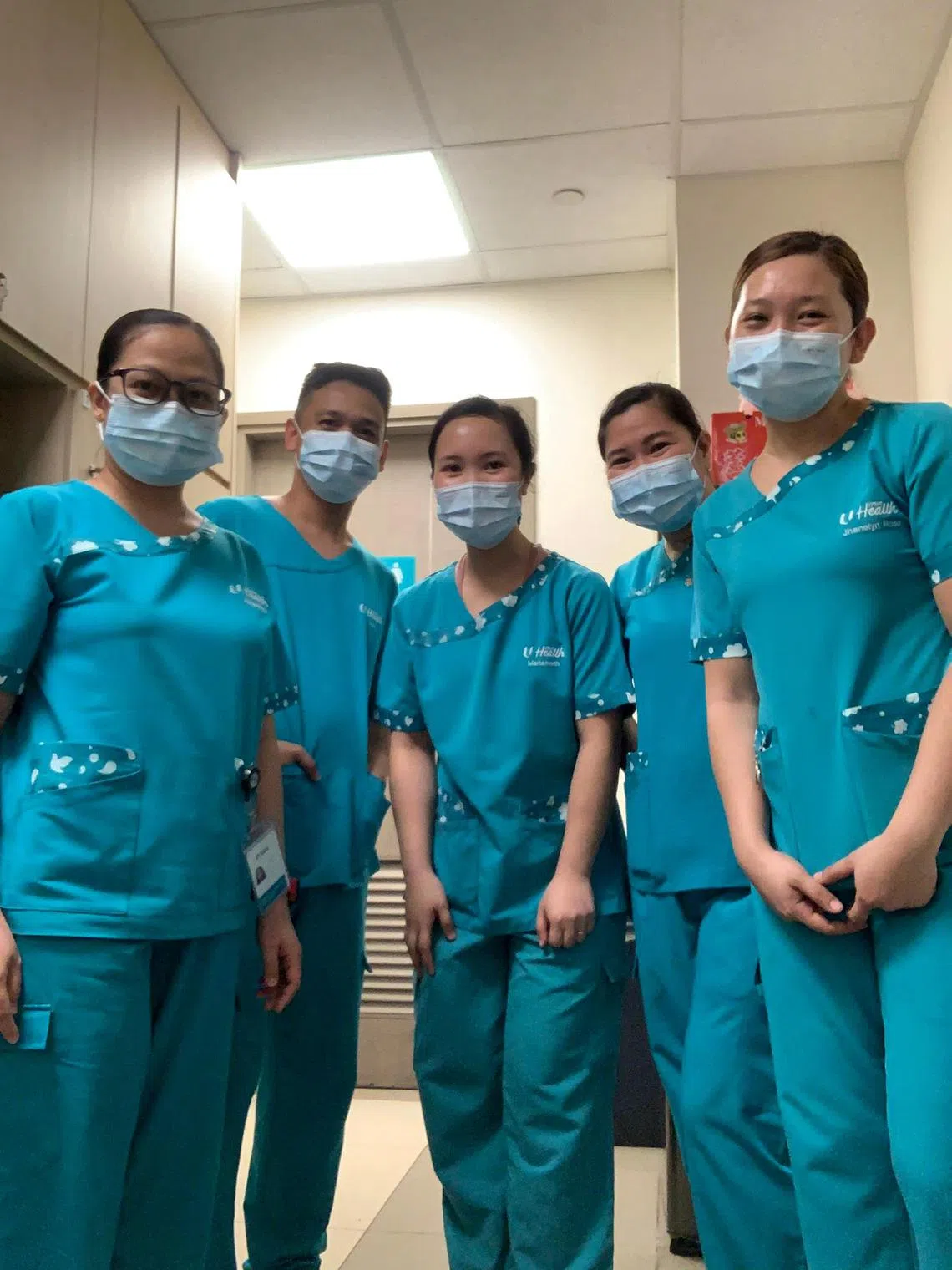 (From right) Staff nurse Bayonon Jhenelyn Rose, enrolled nurse Rojas Danica Figueroa, enrolled nurse Menzi Marianneth, nursing aide Negrillo Frank Gante and staff nurse Herrera Jacquelene Kaye Zubieto.