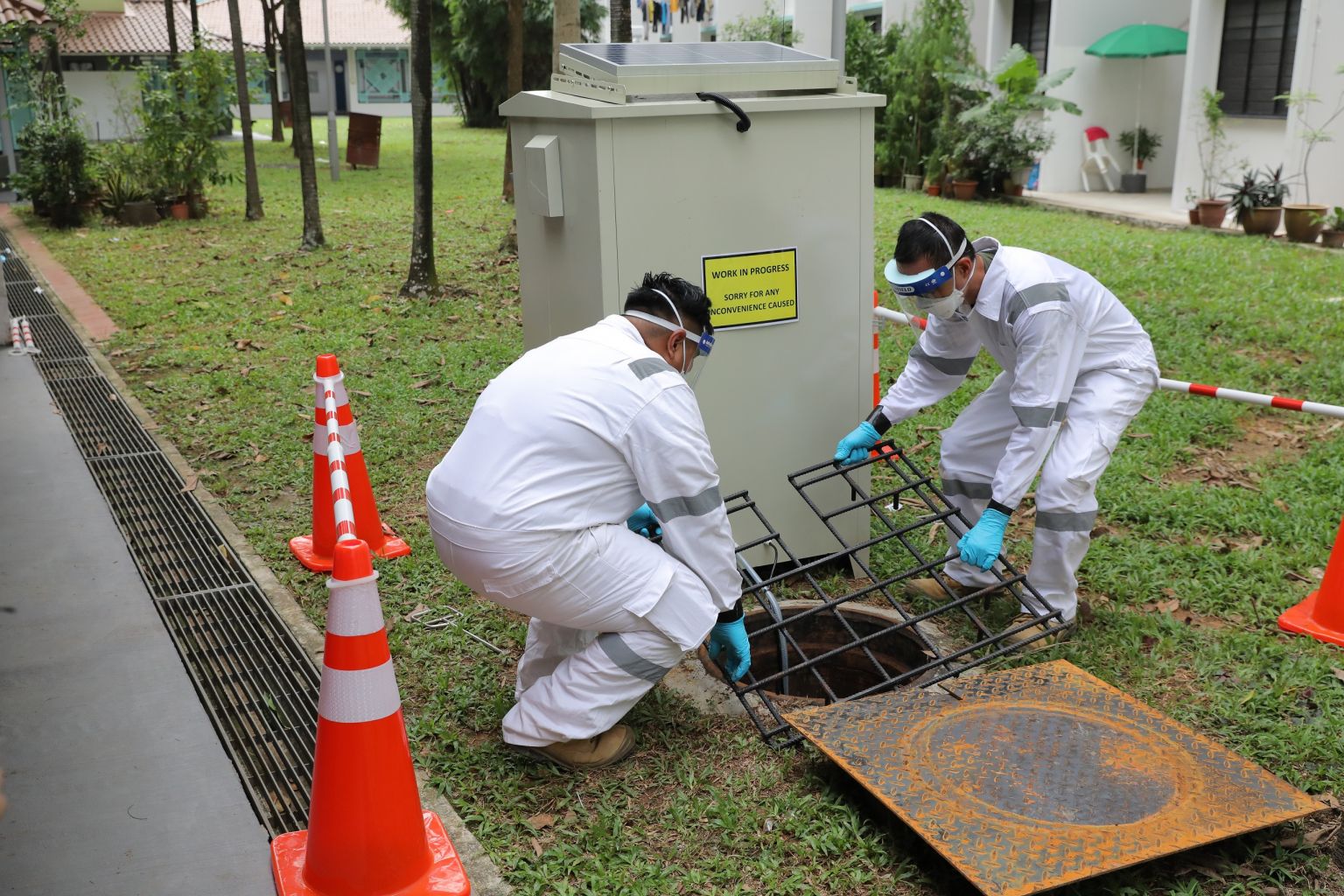 National Environment Agency officers preparing a manhole for wastewater surveillance on July 7, 2021.