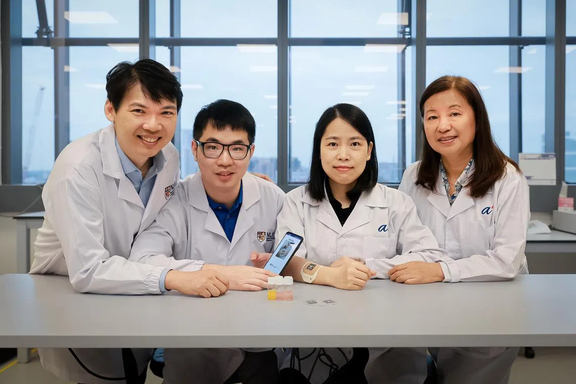 (From left) Associate Professor Benjamin Tee, Mr Yang Zijie, Dr Zheng Xinting and Dr Su Xiaodi with the wound-monitoring sensor patch on June 26, 2023.