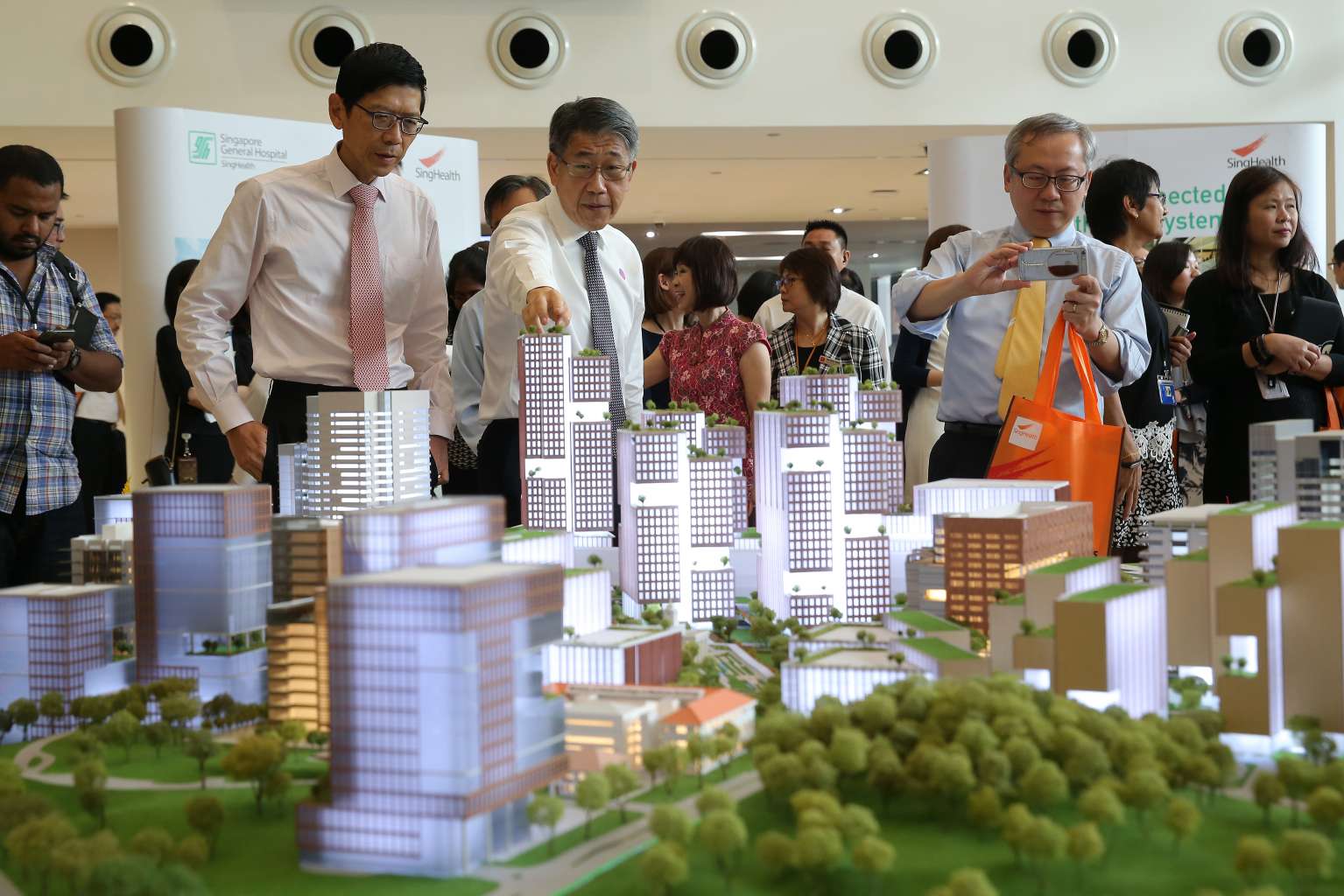Going high-rise: Guests including National University of Singapore president Tan Chorh Chuan (left) taking in a model of SGH's new masterplan, which sees the once sprawling hospital going high-rise to maximise space and efficiency. The tallest building will be the 20-storey National Cancer Centre.