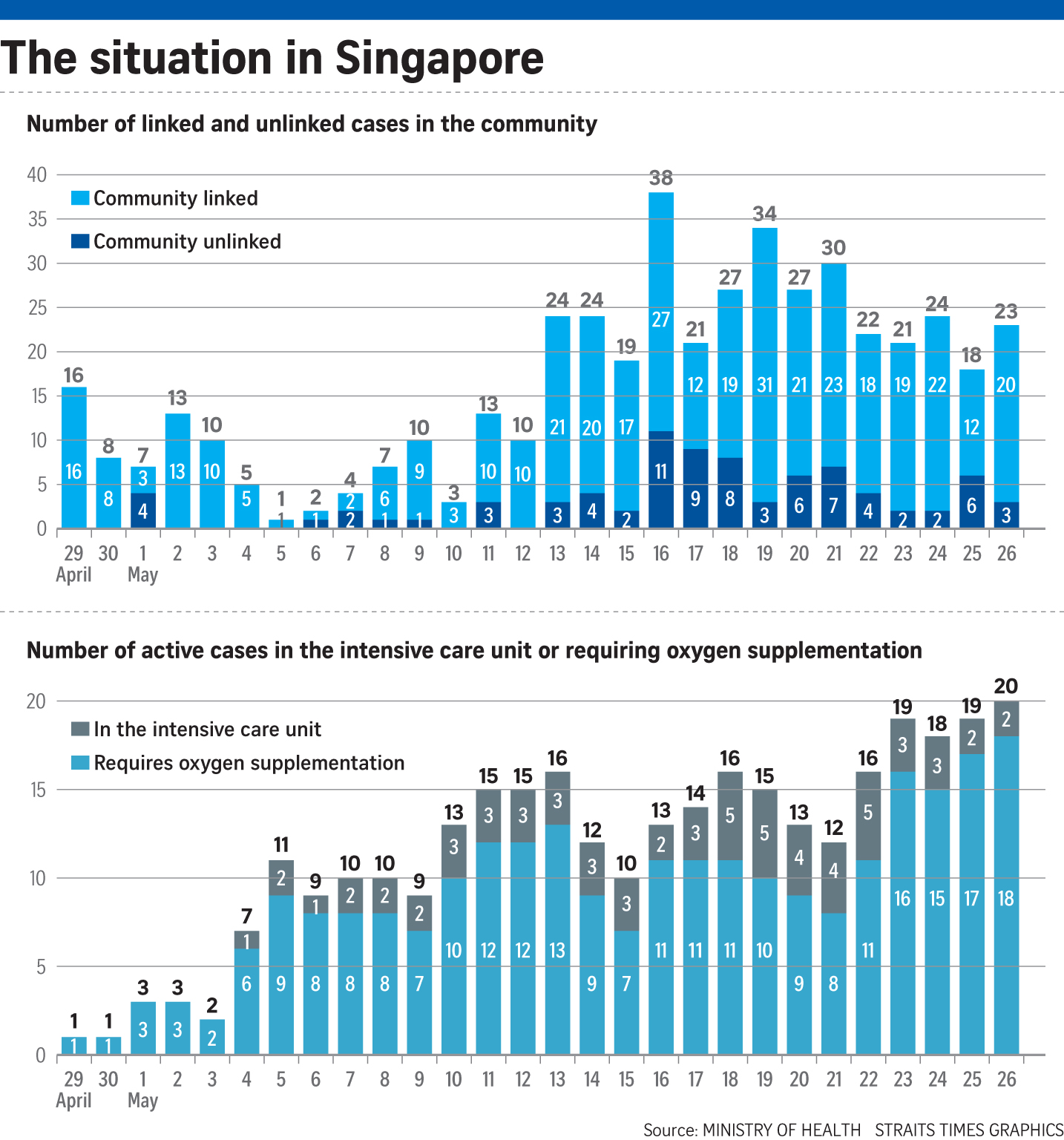 Singapore has not been spared. In the fortnight till May 26, it has seen between 19 and 38 new community cases diagnosed each day. This compares with the one to 16 cases a day in the previous fortnight - despite tighter safety measures.