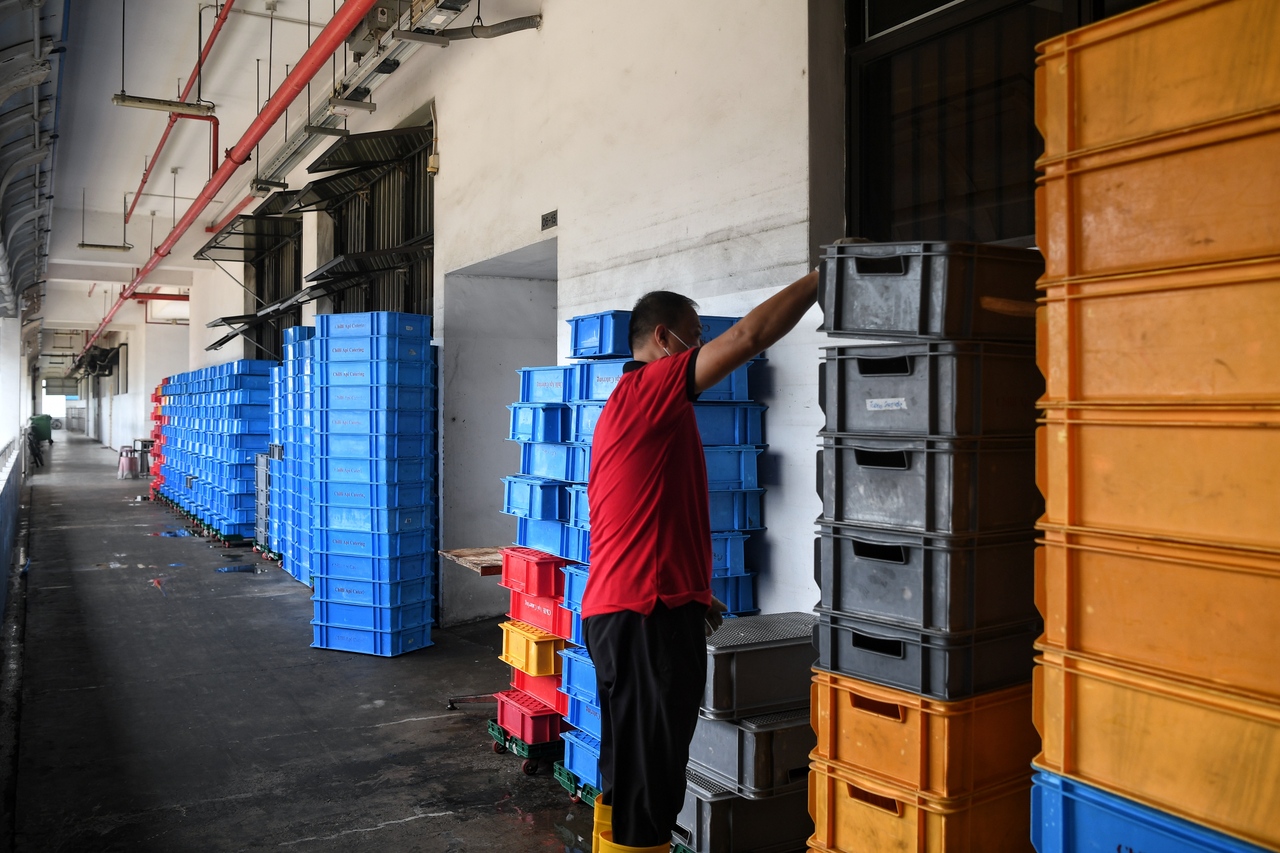 ST20210315_202145235673 Kua Chee Siong/ pixcatering/ A Chinese worker leaving plastic boxes out to dry after washing them outside the Chili Api catering kitchen at the Shimei East Kitchen at Bedok North St 5 on 15 Mar 2021. Chilli Api mass food poisoning case.