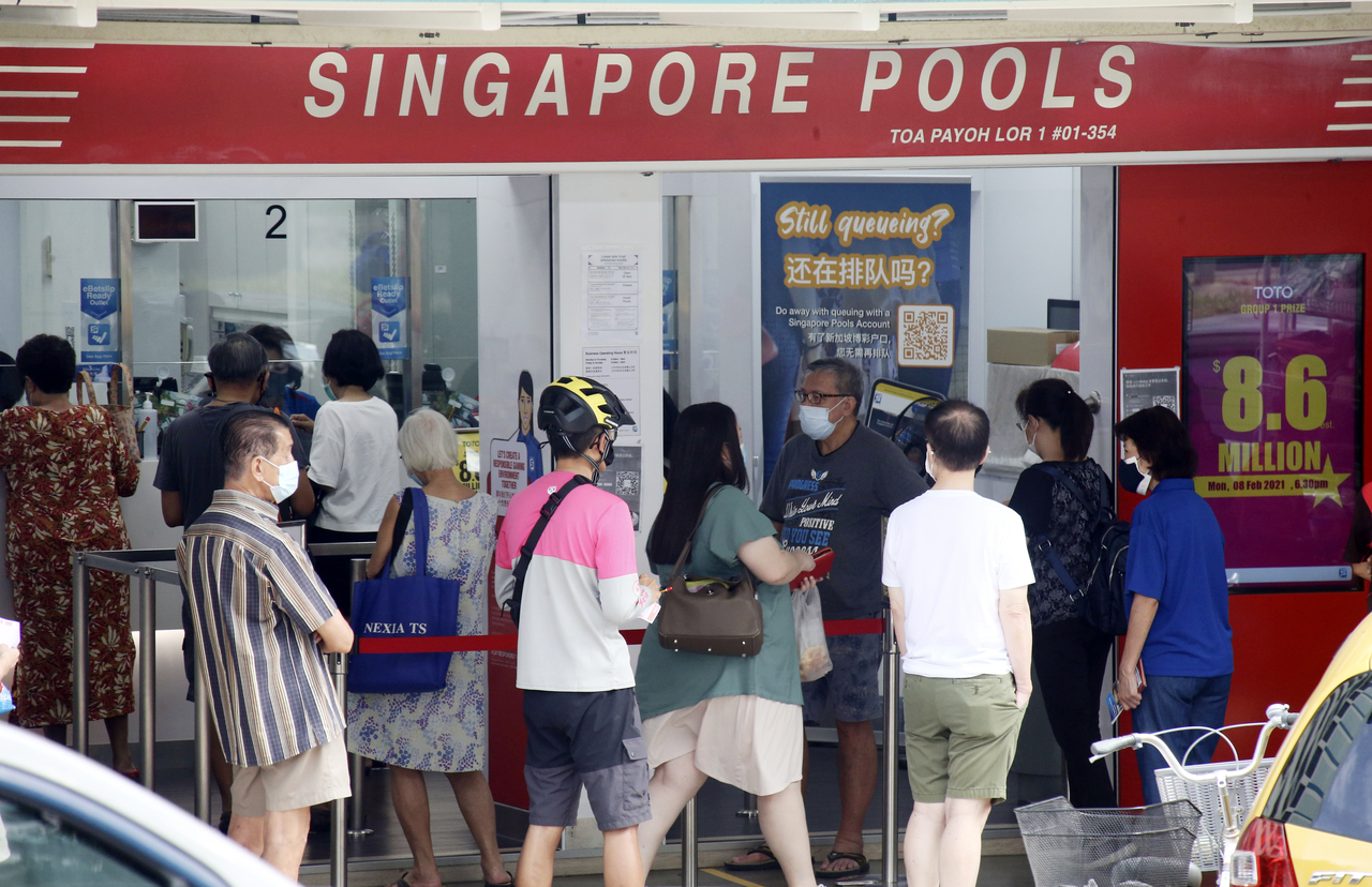 People queueing at the Singapore Pools outlet at Block 111 Lorong 1 Toa Payoh in February 2021.
