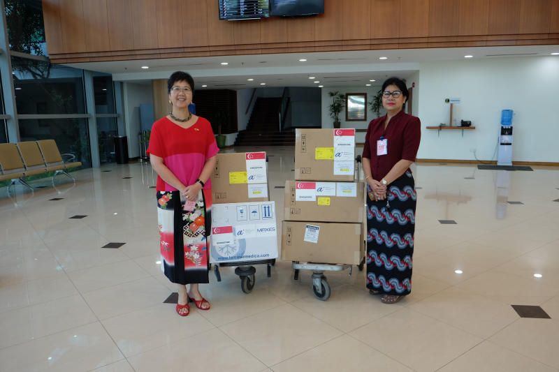 The supplies were handed over by Singapore's Ambassador to Myanmar, Ms Vanessa Chan, to Myanmar National Health Laboratory director Htay Htay Tin at Yangon International Airport.