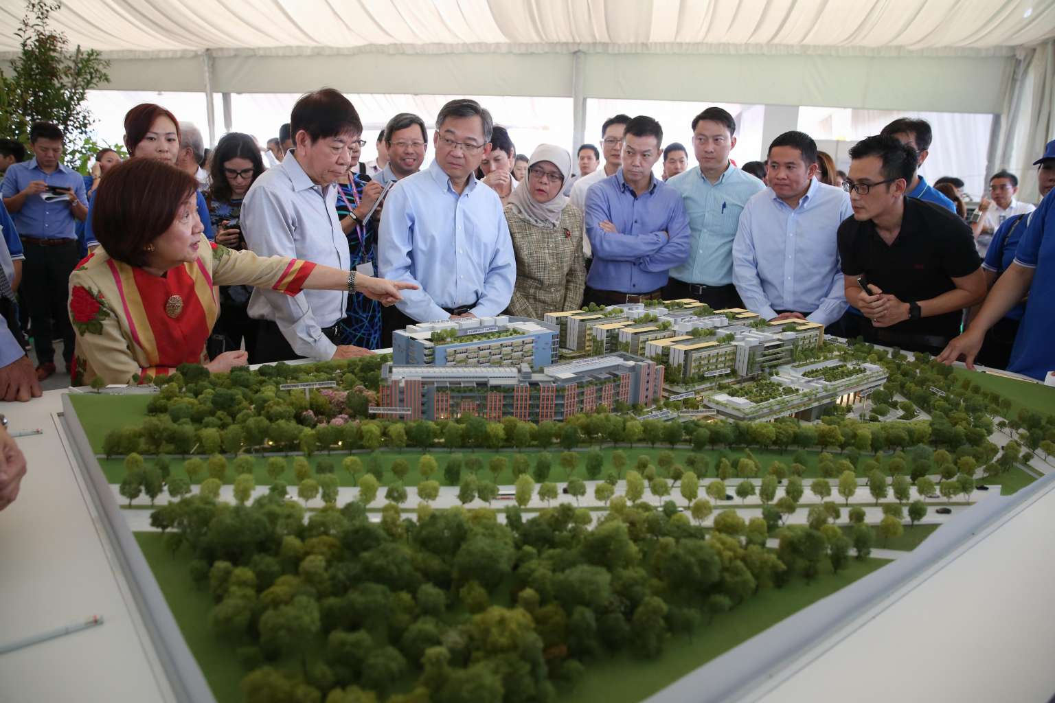 Health Minister Gan Kim Yong views a model of the Woodlands Health Campus at the ground-breaking ceremony on Tuesday (April 18).