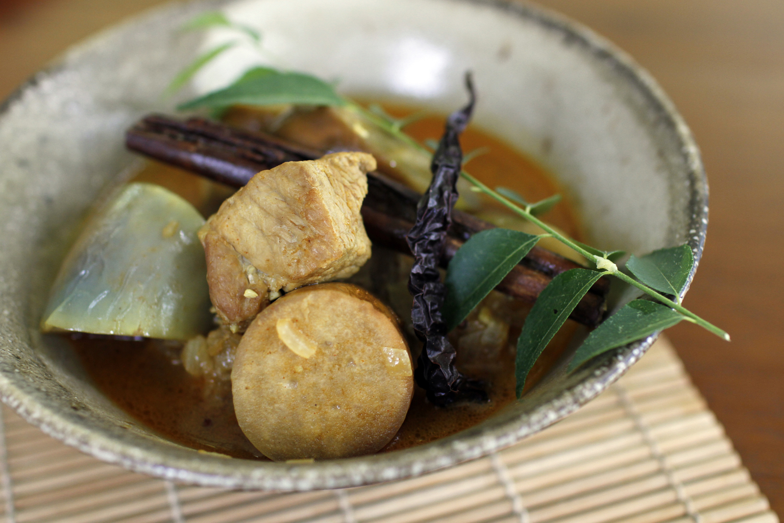 The cut of meat matters. The leanest is the fillet, which is also the most tender, but, for curry, I choose the pork collar, which, admittedly, has more fat, but also a more interesting texture.