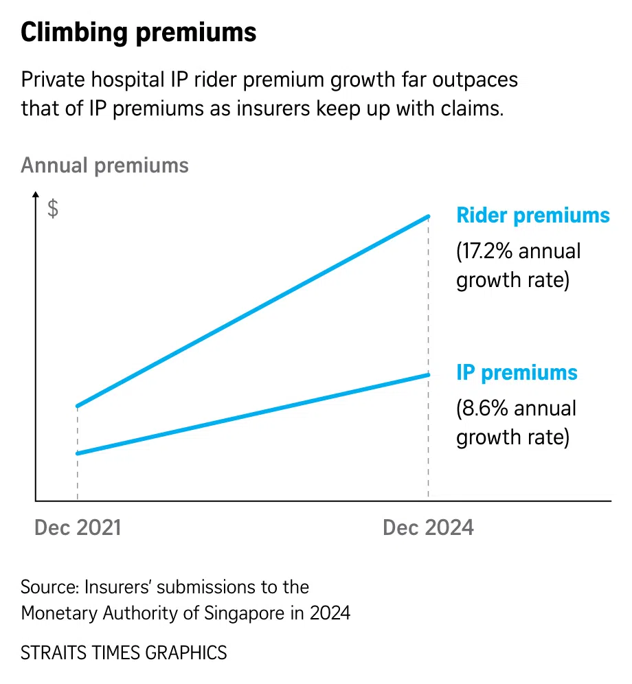 This has resulted in insurers raising the premiums of private hospital IPs and riders significantly to keep up with claims, with rider premiums seeing an annual growth rate of 17.2 per cent from December 2021 to December 2024, double that of the 8.6 per cent growth rate for private hospital IP premiums over the same period.