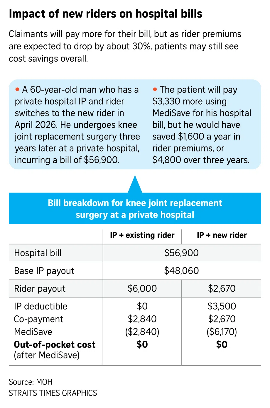 New riders sold from April 1, 2026 will no longer be allowed to cover the minimum deductibles patients have to pay before insurance kicks in. This means those with private health insurance will need to pay at least $1,500 for any hospital stays within the policy year, before they can claim from insurance. The IP deductibles payable could go beyond $3,500.
