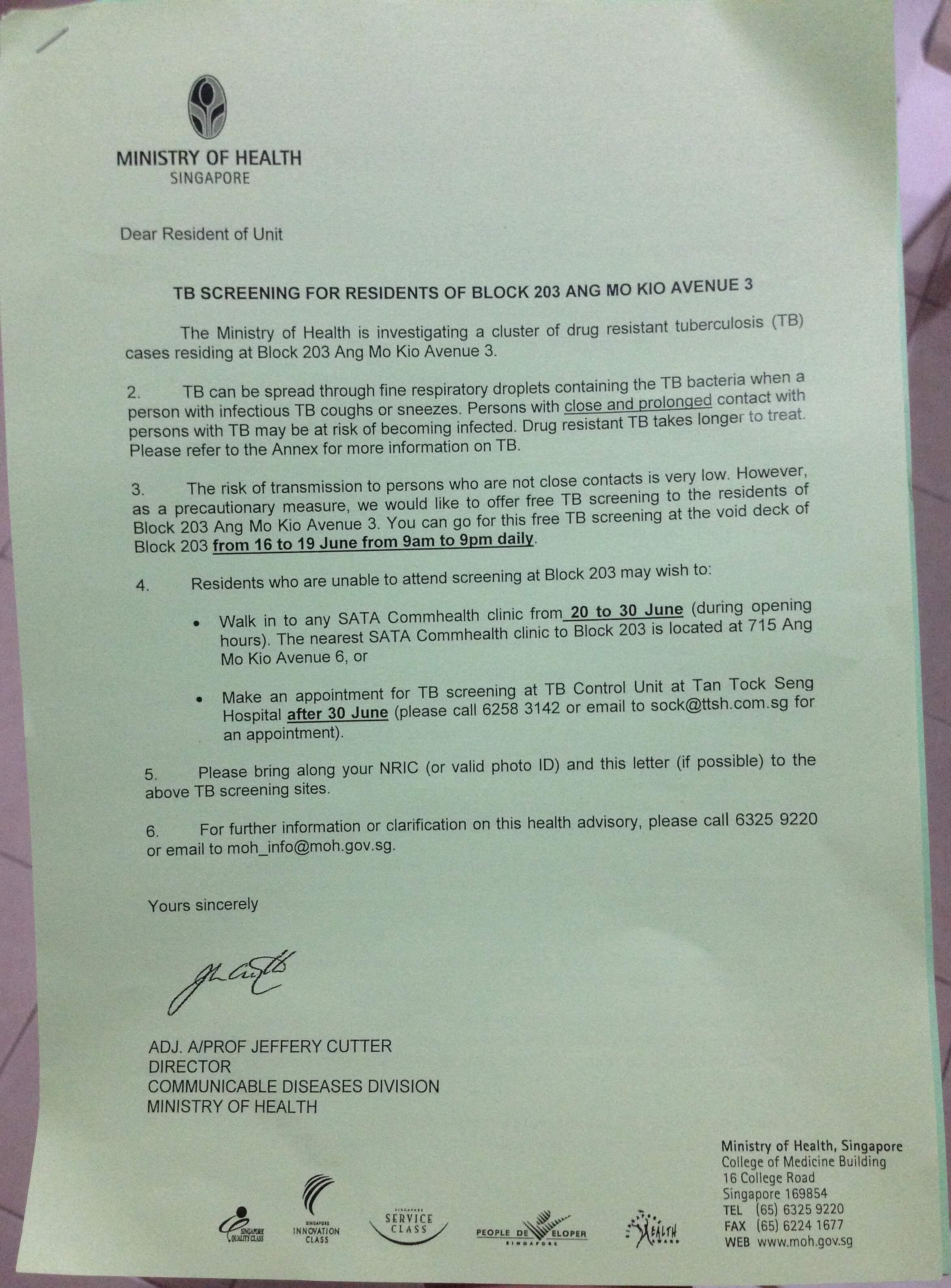 Former residents who lived in the block from July 2011 can also go for screening at any Sata clinic until June 30. After that, residents and former residents can make an appointment at the TB Control Unit.