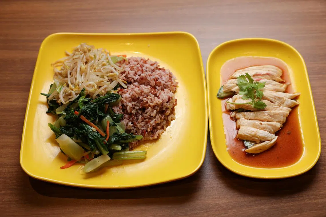 lyhawker ST20240126_202406127635 Ong Wee Jin / Lee Li Ying / Li Ying's meal at Market Street Hawker Centre - Brown rice with veggies (left), and chicken breast (right) from chicken rice stall. Feature story whether it is possible to eat a healthy diet in Singapore while only (or by majority) consuming hawker food. Two ST reporters will undergo a social experiment where they will only eat hawker food consecutively for 5 days and log all that they eat. Then, dieticians/nutritionists will review and rate their meal choices.