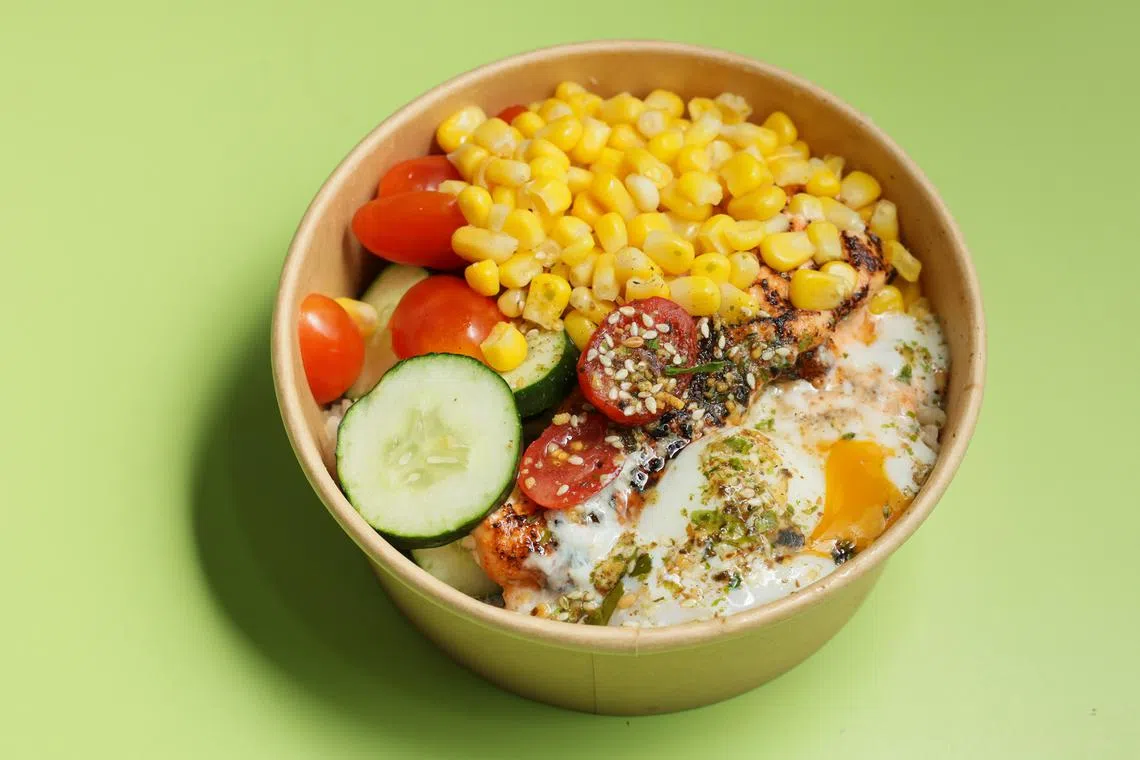 ST20240215_202463177385: Gin Tay/ azhawker/ Zhaki Abdullah/ Mentaiko salmon rice bowl with brown rice, corn and tomato ($9.50) from Big Bowls Project located at Amoy Street Food Centre, photographed on Feb 15, 2024.