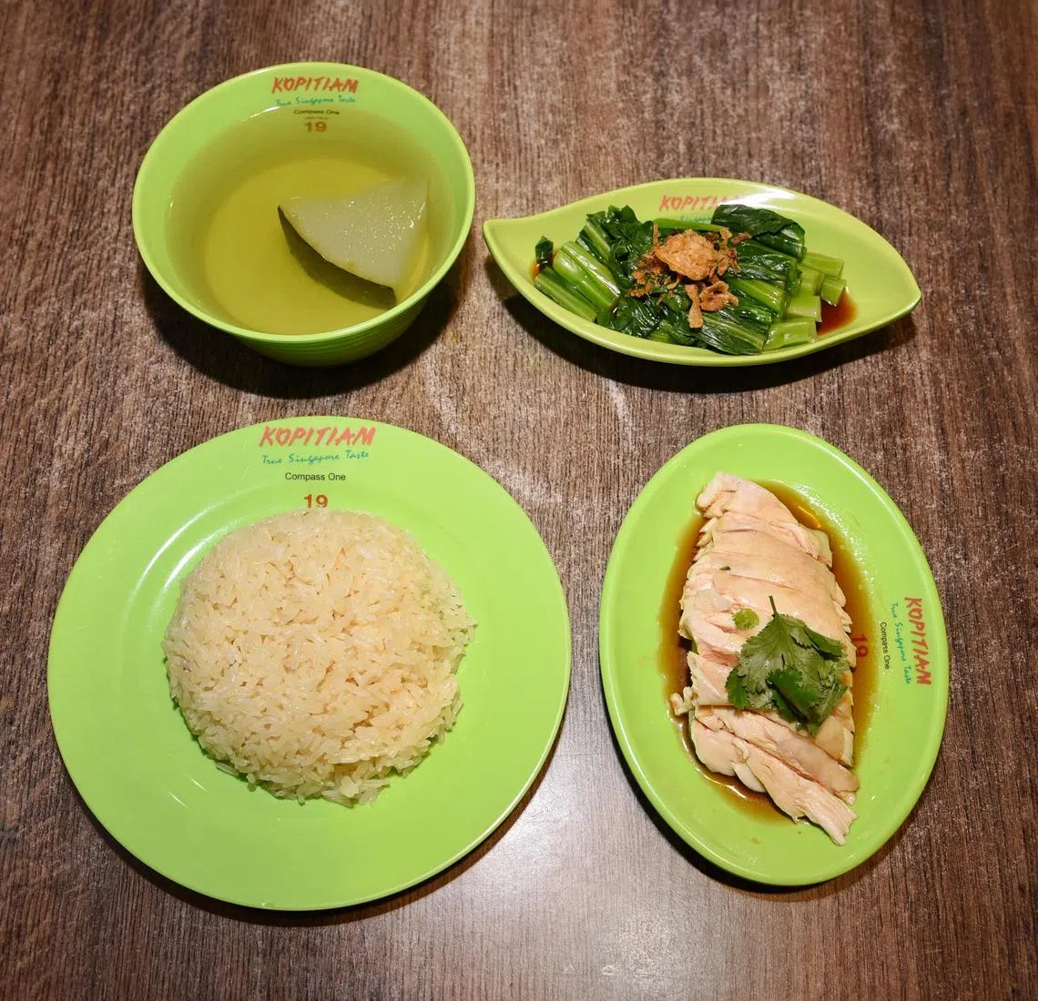 ST20240216_202413247012/ azhawker/Heng Yi-Hsin/Zhaki Abdullah Steamed Chicken Rice Set from Sengkang Compass One food court. Photographed on Feb 16, 2024. For a feature story on two ST reporters attempting to eat healthy hawker meals for lunch and dinner as a part of a five-day long challenge. ST PHOTO: HENG YI-HSIN