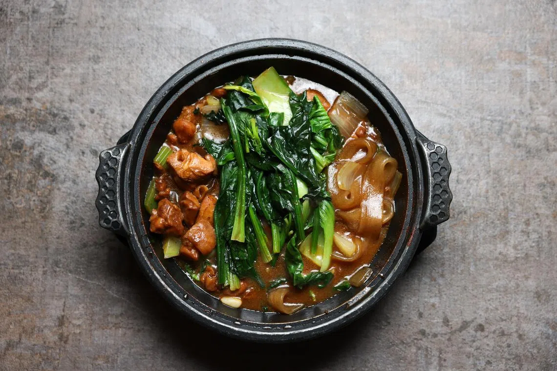 Braised chicken in Chongqing-style broth, with spinach and kailan, and sweet potato noodles